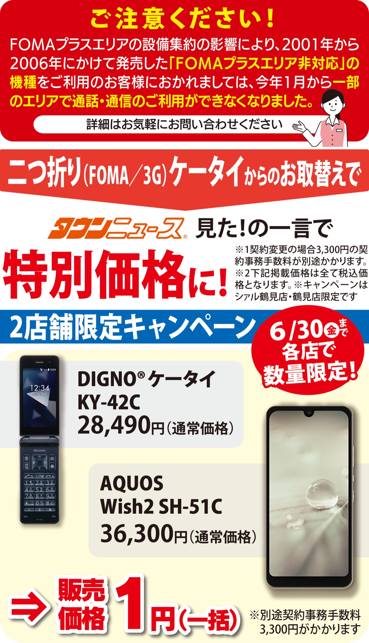 そこでドコモショップ鶴見店とシァル鶴見店では、「思い切って切り替えよう」という人向けに初心者に人気の機種などを期間限定の特価で用意。機種代「1円」(事務手数料3300円)で機種変できる。また、購入後もスタッフが電源の入れ方などから親身に説明し、無料のスマホ教室などサポートも充実しているので安心だ。