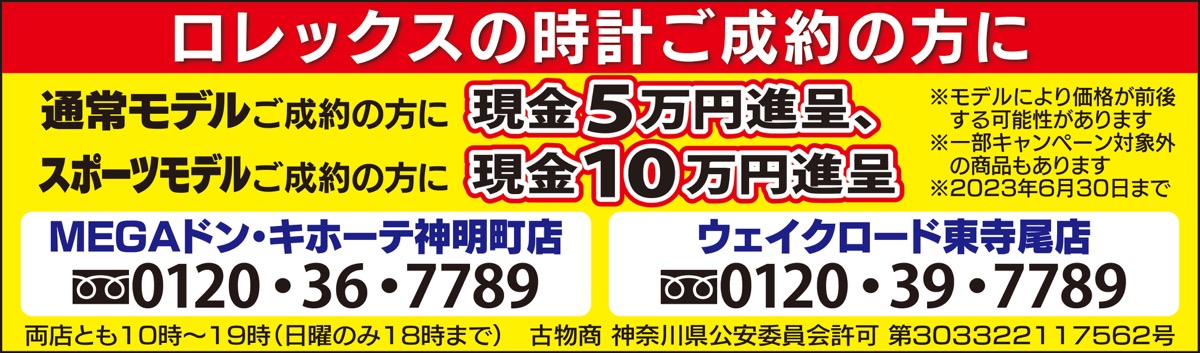 さまざまな品物の査定に対応する買取専門店「おたからや」は、腕時計・ロレックスの買取を強化している。スポーツモデルの買取成約で、買取金額と別に現金10万円を進呈。スタッフは「動かなくなってしまった、ガラスが割れてしまった時計でも問題ありません。つけなくなった時計は、この機会に整理しませんか」と話す。