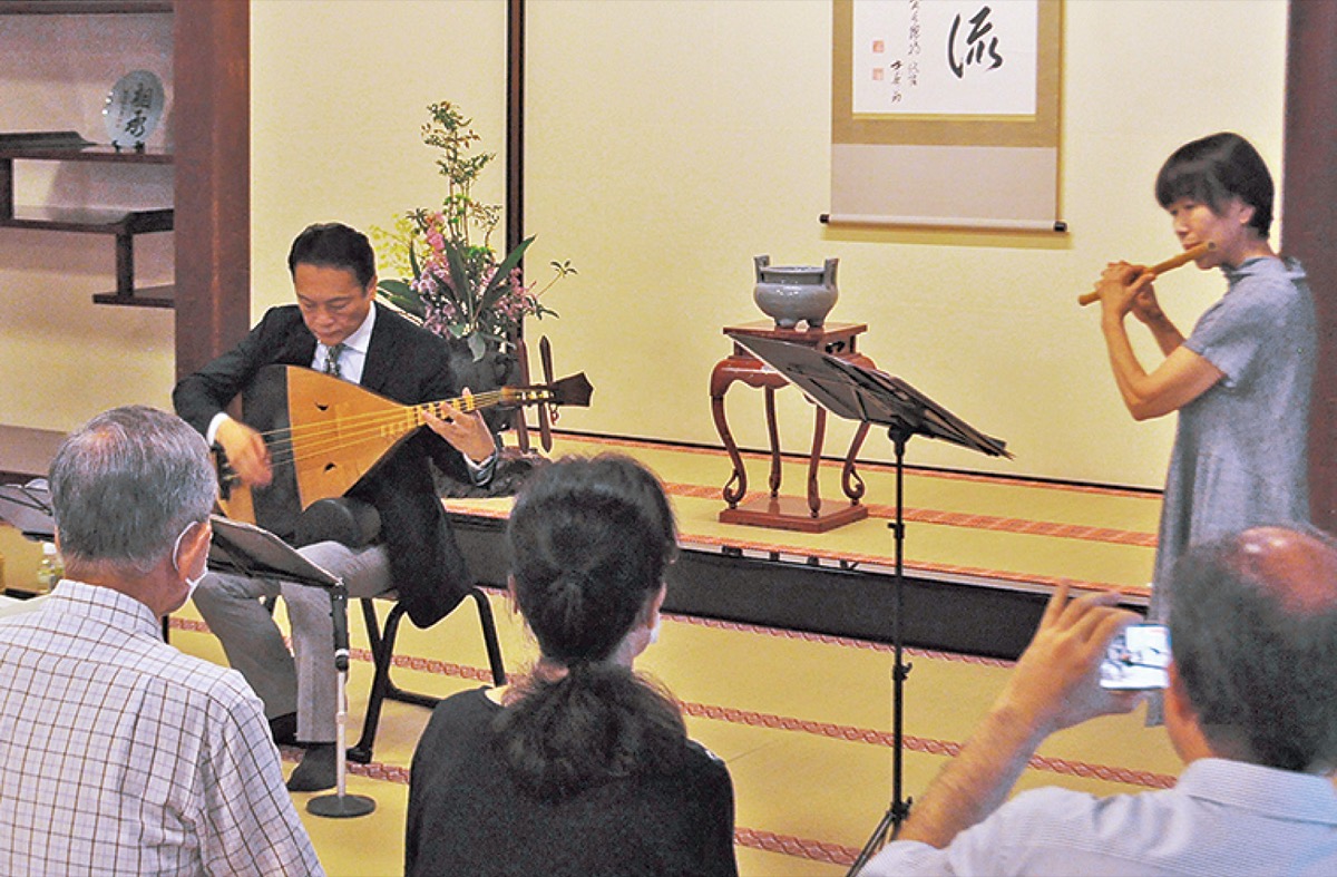 当日は約150人が参加。講師には伝統的な雅楽古典曲から現代曲まで演奏し、国内外で活動する琵琶奏者の塩高和之さんを招き、国の登録有形文化財に指定されている紫雲臺の広間に琵琶の美しい音色が響いた。