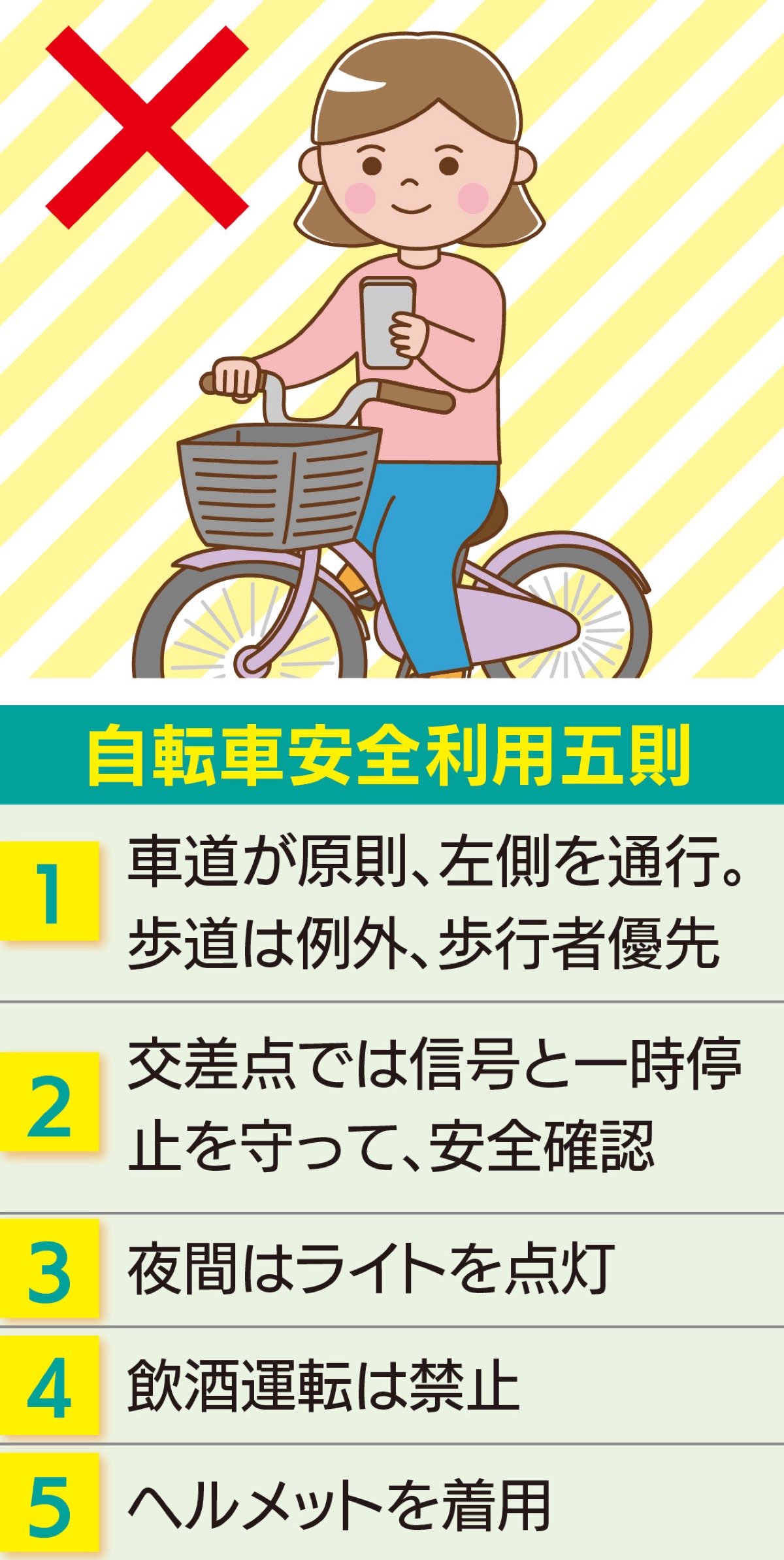 また、歩道の走行や曲がり角でのスピードの出し過ぎなど、年齢を問わず事故原因になるケースが多い。県警では「自転車安全利用五則」を定め、交通ルールを守った運転を喚起している。