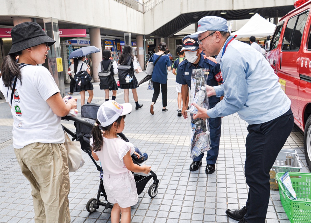 鶴見消防署(川村滋署長)が7月20日、キリンビール(株)横浜工場らと協力して、熱中症予防の呼びかけを鶴見駅西口で行った。