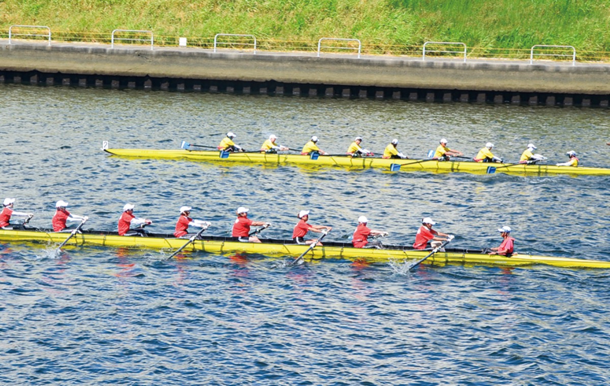 年齢別に4人漕ぎのナックルフォアやクオドルプル、舵手付フォア、エイトの4種目で、小学生から80歳以上の約500人が参加。森永橋から下水道水管橋までの350mを2回漕ぎ、その合計タイムで順位を競った。
