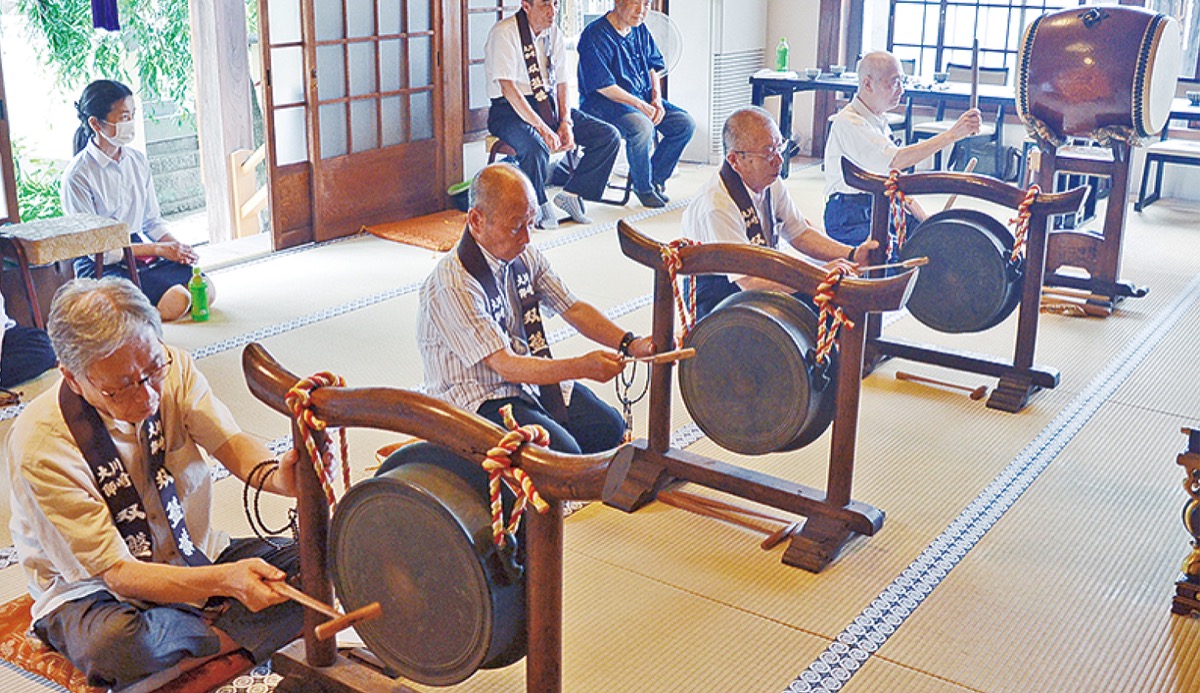 生麦の正泉寺で7月13日、仏教音楽などで用いられる打楽器「双盤」や太鼓を鳴らし念仏を唱える伝統仏事「双盤念仏」が4年ぶりに行われた。