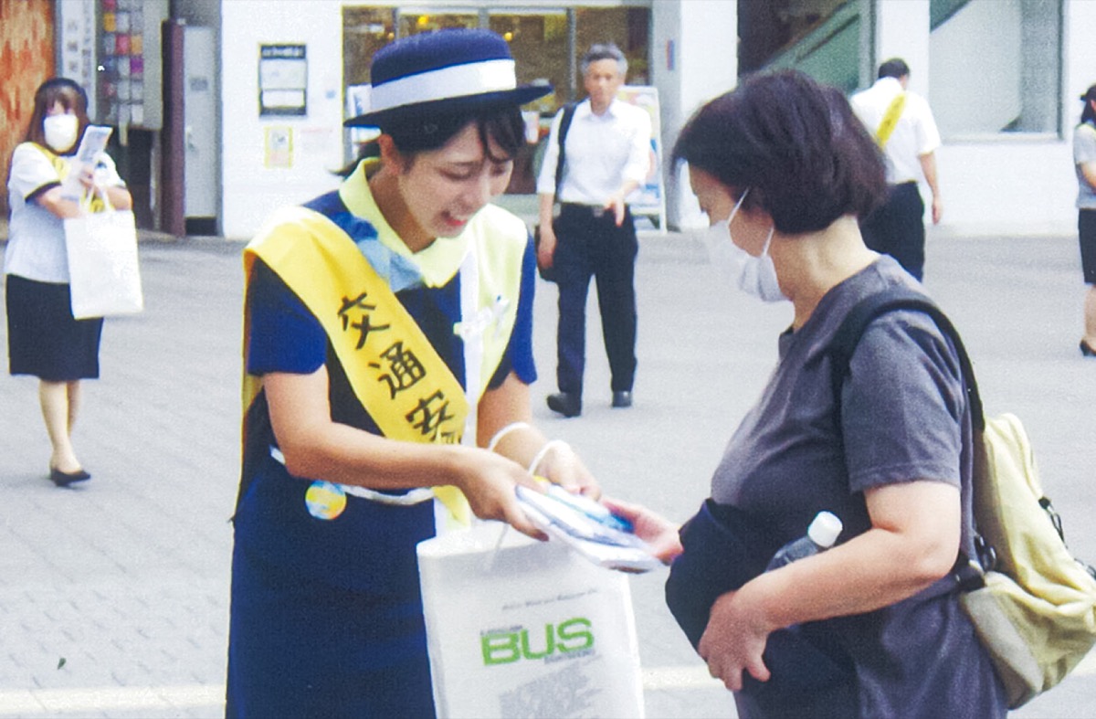 当日は神奈川県庁で出発式が行われ、一行は鶴見駅で鶴見警察署と合流。飯塚博史署長が「1件でも事故を減らすために今回の運動を共に行えれば」と呼びかけた。その後、同協会加盟事業者のバスガイド約30人と鶴見署の署員らが、制服姿で交通安全の標語が書かれた啓発物の配布を行い、通行人と笑顔で話す場面も見られた。