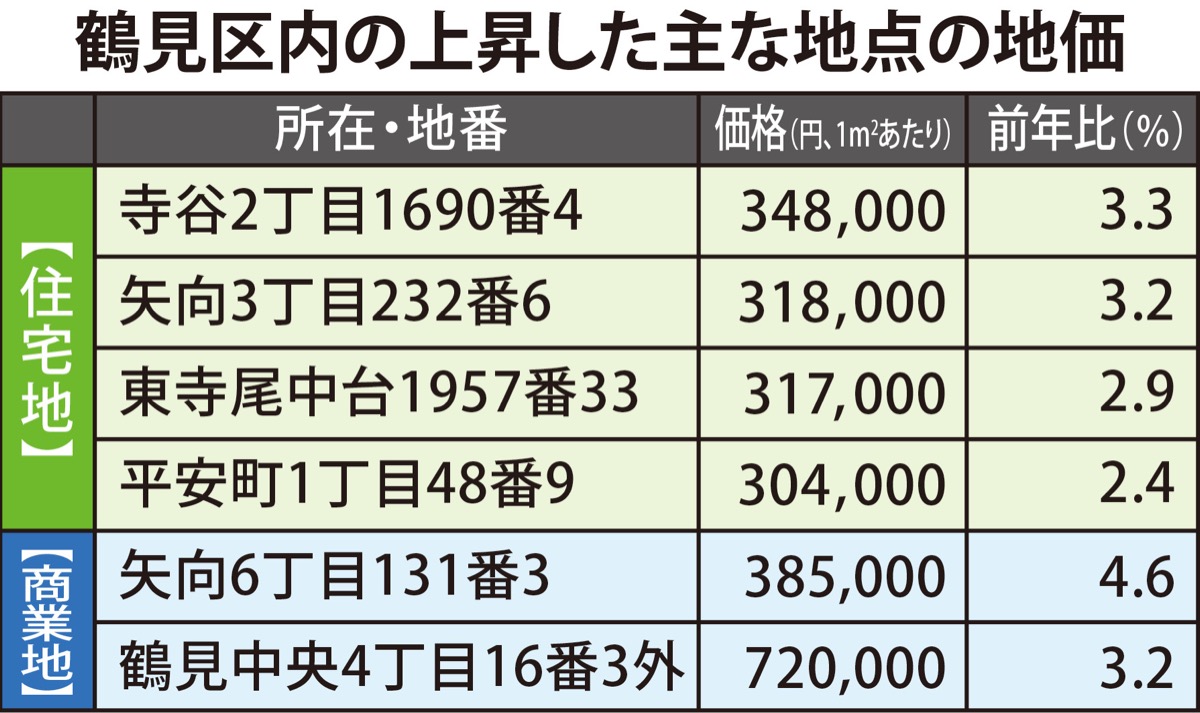 また、商業地でも住宅地と同様の傾向が見られ「矢向6丁目131番3」が4・6%と最も上昇し、「鶴見中央4丁目16番3外」が3・2%で続いた。市内全体では5・3%上昇した。
