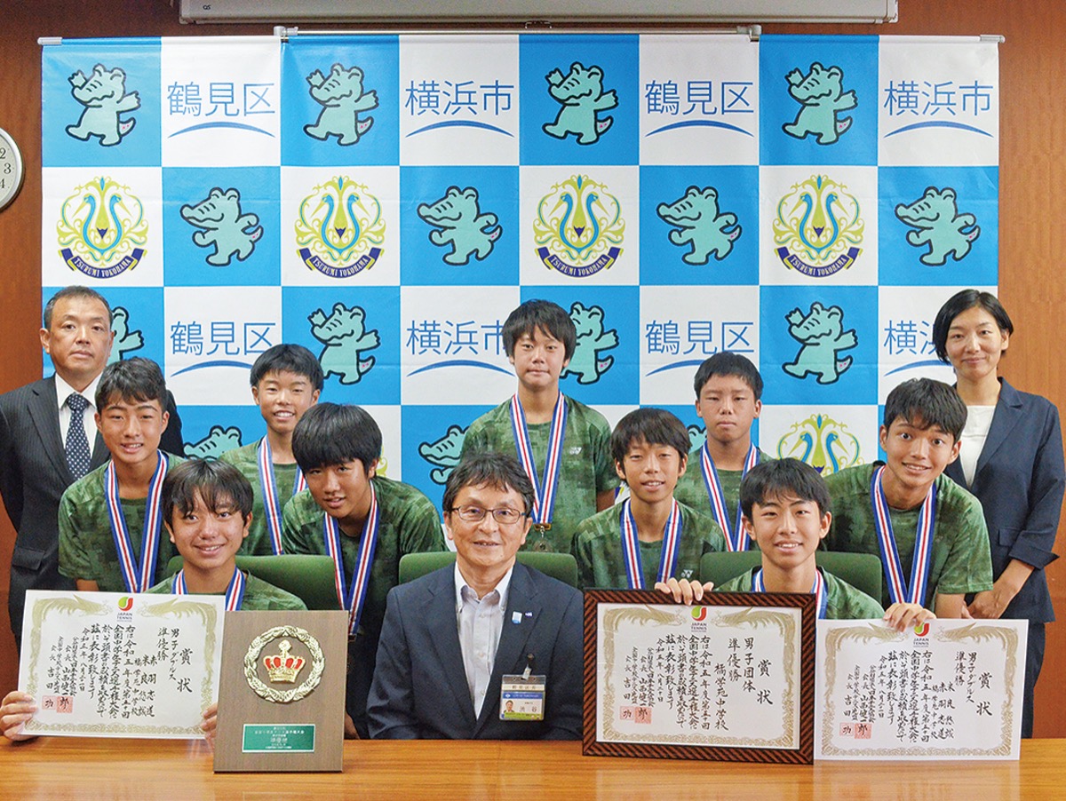 8月に行われた第50回全国中学生テニス選手権大会の男子団体、ダブルスの2部門で準優勝した橘学苑中学校硬式テニス部が10月2日、渋谷治雄区長を表敬訪問し大会結果を報告した。