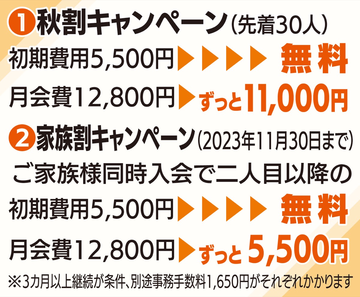 今なら秋割キャンペーンで、入会者先着30人に初期費用無料、月会費が11000円に割引される特典を実施中。さらに11月末までは、家族の同時入会で二人目以降も初期費用無料、月会費が5500円となる。無料体験説明会を随時受付。詳細は問い合わせを。