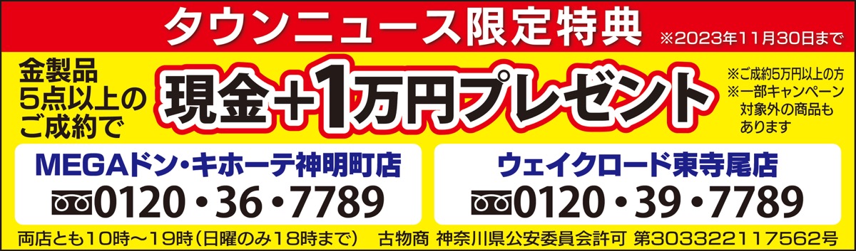 東寺尾の商業施設「ウェイクロード横浜鶴見」2階にある買取専門店「おたからや」は、金製品の買取を強化している。11月末まで5点以上の買取成約で、買取金額にプラスして現金1万円を進呈。スタッフは「まだまだ金の高値が続いています。使っていないアクセサリーなどは、今が売却のチャンスかもしれません」と話す。