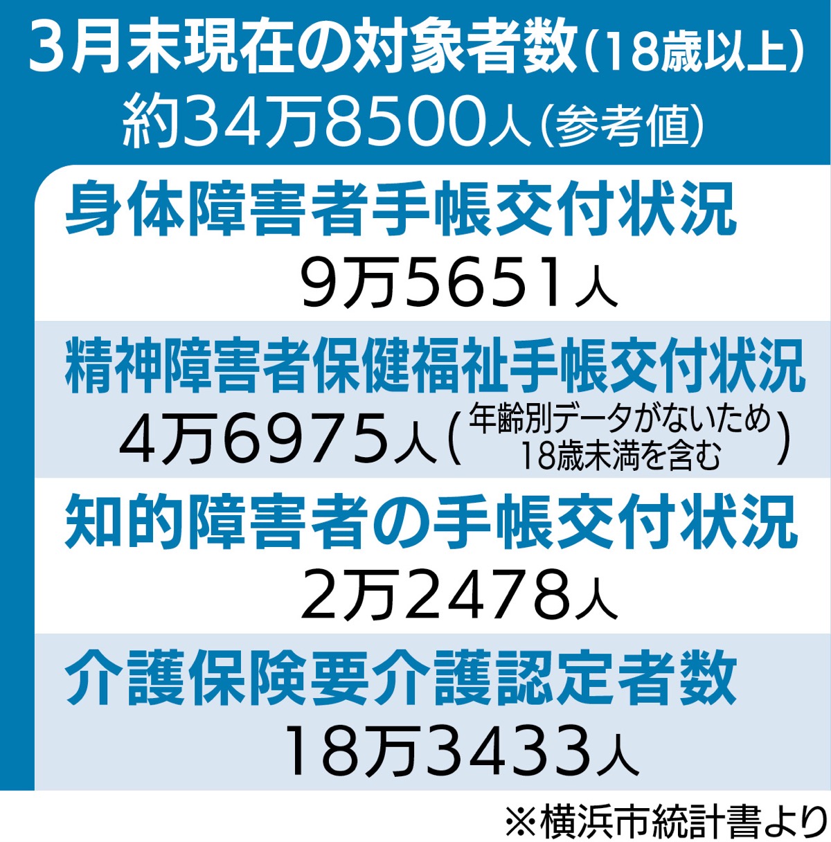 対象は身体・精神・知的の各手帳が交付されている18歳以上および、要介護認定を受けている全ての人。今年3月末現在で、おおよそ34万8500人(精神の手帳交付は年齢別情報がなく18歳未満を含む)になる。