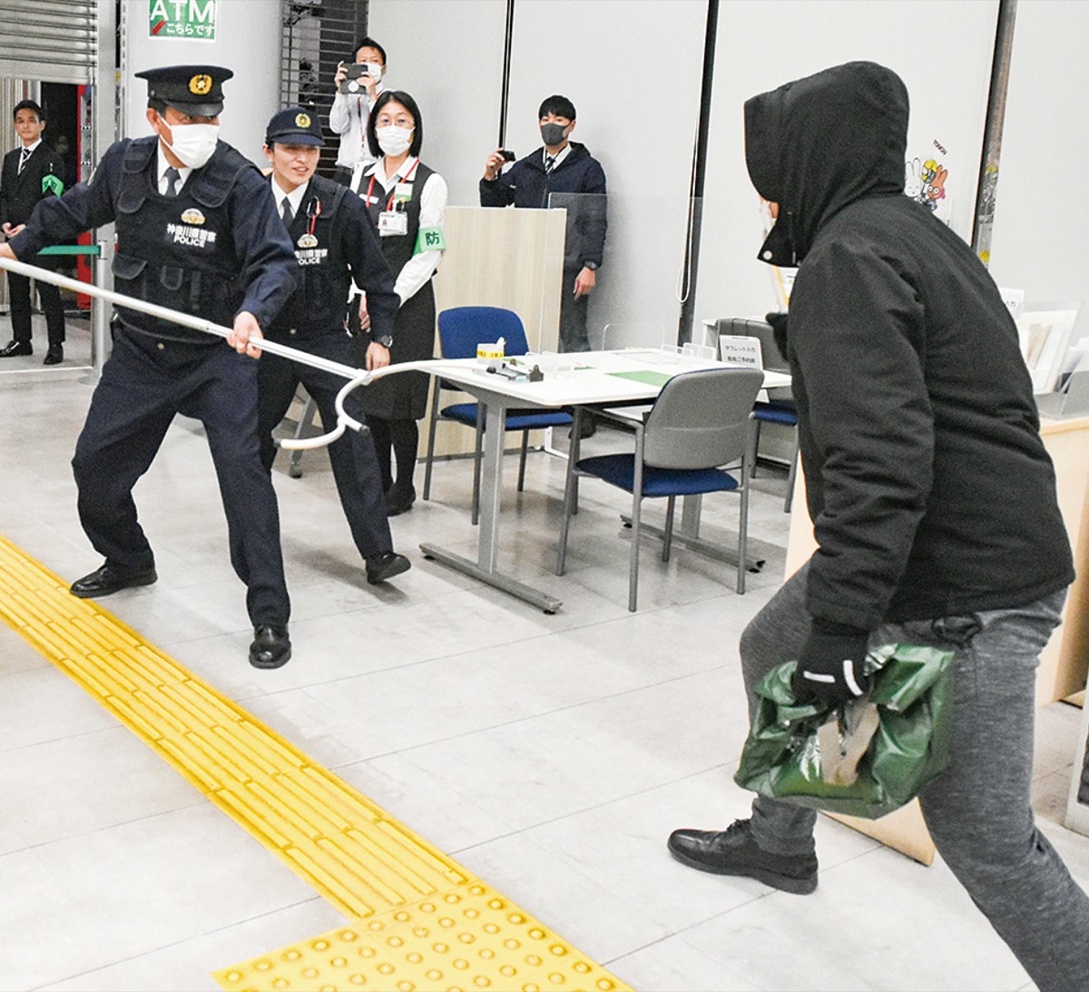 これは同店と鶴見警察署が協力したもので、訓練は窓口で金銭を要求された場合を想定。犯人役が刃物を出して「金を出せ、急げ」と威嚇。さらにカウンターの中にも侵入し、職員を脅迫。通報を受けて警察官が駆け付けた際には職員を人質に取るなど、緊迫した状況に。最後は警察官がさすまたで犯人役を逮捕し、訓練は終了した。