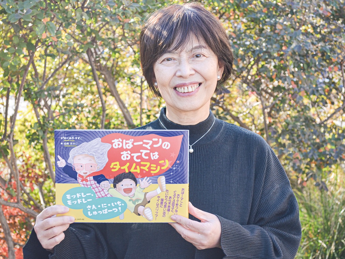 獅子ケ谷在住の奥秋鈴子さん(65)がこのほど、絵本「おばーマンのおててはタイムマシン」を出版した。