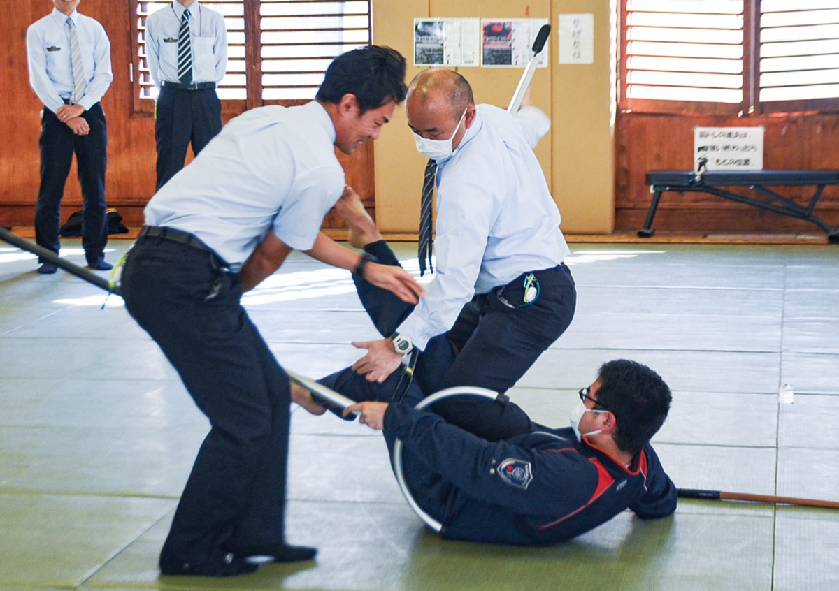 後半では刃物を持った犯人が暴れている場面を想定し、さすまたなどを使った対応訓練が行われた。