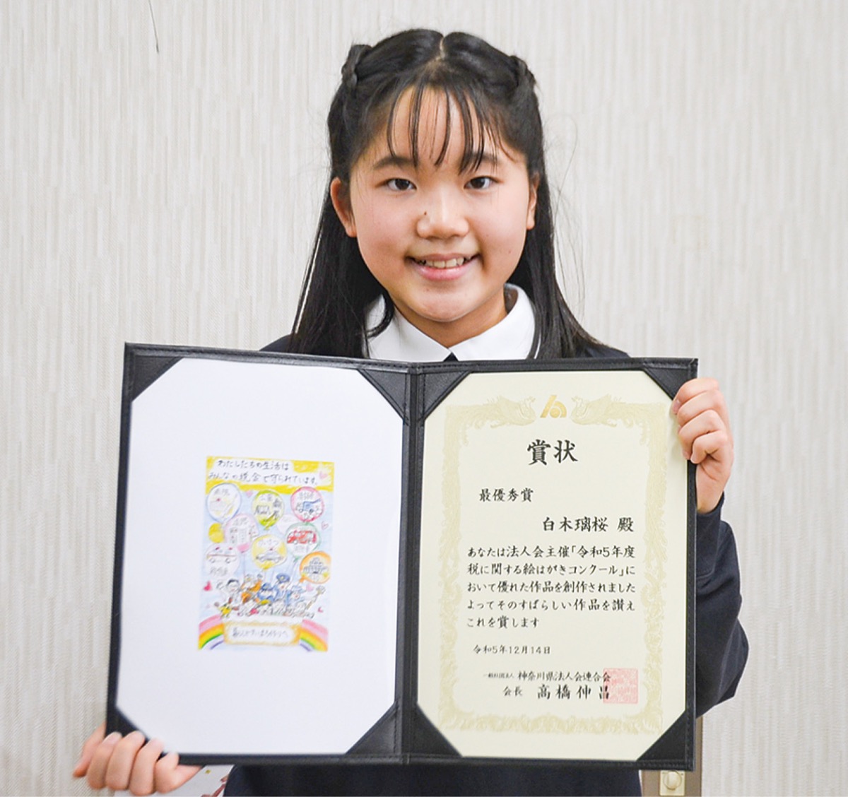 鶴見小学校6年の白木璃桜さんがこのほど、(一社)神奈川県法人会連合会主催の「令和5年度 税に関する絵はがきコンクール」で最優秀賞を受賞した。白木さんは「受賞できると思わなかったので本当に嬉しい。税金で私たちの生活が守られていることを多くの人に伝えられたら」と喜びを語った。