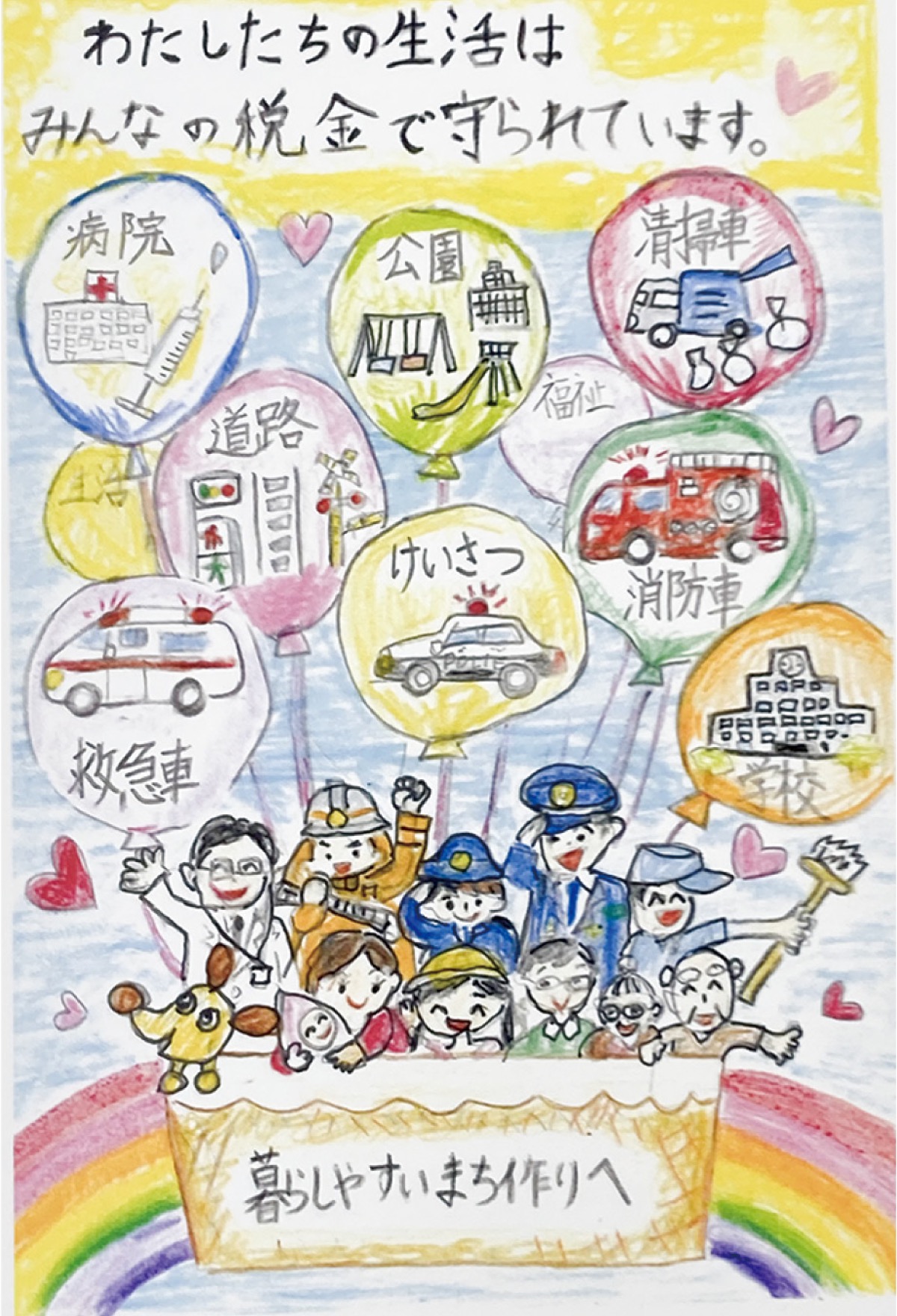 白木さんの作品は、警察署や消防署など、「普段通学路でよく見る施設が実は税金で作られていると知って、感謝の気持ちを描いた」もの。「気球に乗る一人ひとりの表情を豊かに描くのが難しかった」とはにかむが、豊かな想像力で色鮮やかな作品に仕上げた。「受賞は本当に驚き。いろいろなことをするのが好きで、いつも支えてくれる家族や友達に感謝したい」と笑顔で語った。白木さんの作品は現在、東京国税局管内でのコンクールに進んでいる。