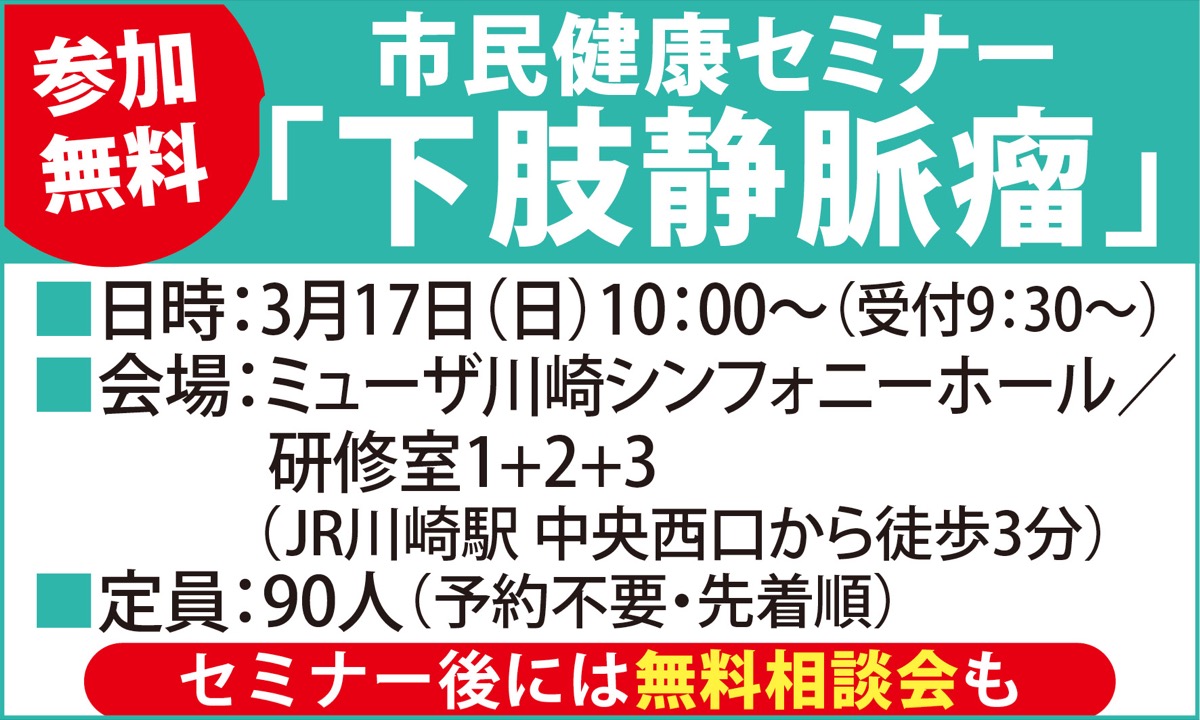 足の血液が逆流し、コブやうっ血を引き起こす「下肢静脈瘤」について、心臓血管外科の専門医が詳しく解説する無料の市民健康セミナーが3月17日(日)、ミューザ川崎シンフォニーホールで開かれる。午前10時から。セミナー後には無料相談会も開かれる。