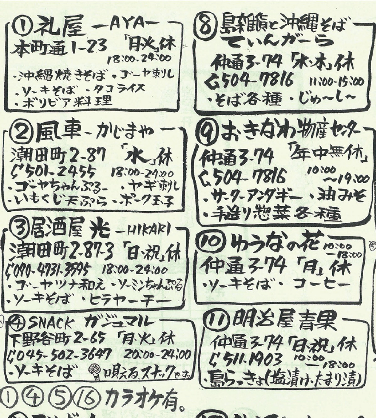 今回作成したのは「潮田界隈 沖縄料理店及び沖縄料理提供店マップ」。潮田界隈に点在する19の料理店などを地図だけでなく、各店舗の営業時間やおすすめ料理などと共に紹介している。同会の土屋信太郎さんは「このまちに暮らす私たちだからこそ知る分かりづらい場所や新しいお店、そして地元で人気の名店など、潮田の魅力を伝えたかった」と語る。