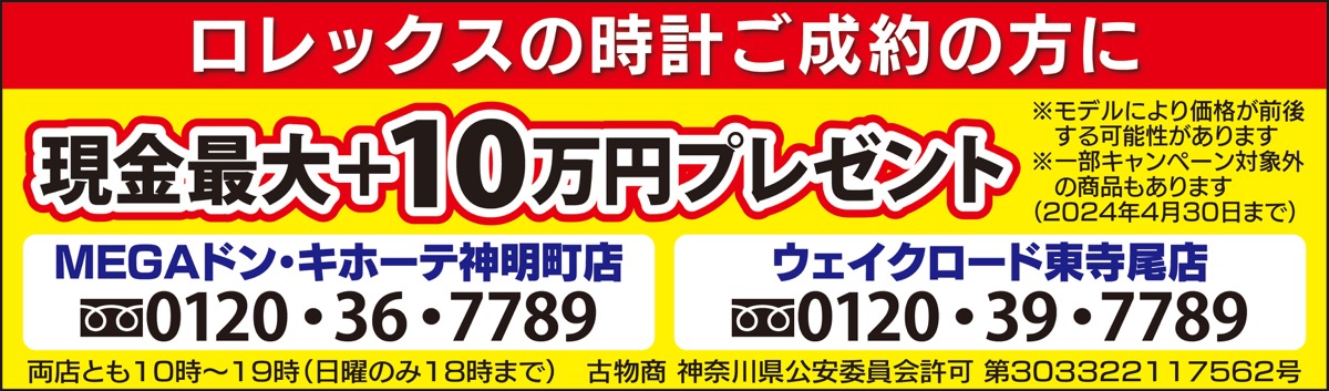 国道1号線(第二京浜)沿いの商業施設「ウェイクロード横浜鶴見」2階の買取専門店「おたからや」では4月末まで、腕時計・ロレックスの買取を強化中。買取成約で買取金額と別に最大で現金10万円を進呈している。スタッフは「動かなくなってしまった、ガラスが割れてしまった時計でも問題ありません。この機会に、査定だけでもしてみませんか」と話す。