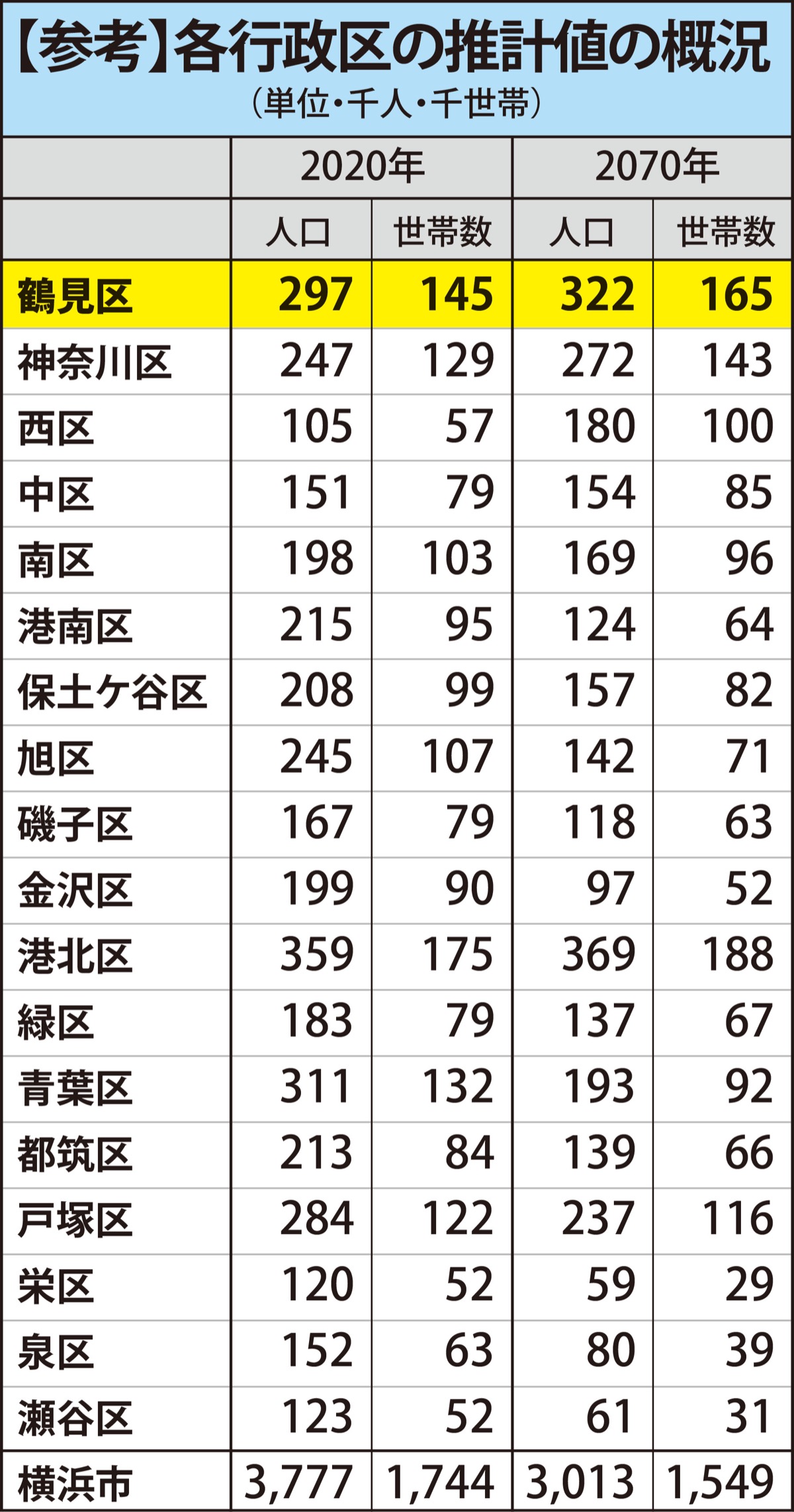 横浜市はこのほど、2070年までの各区別の人口推計の結果を公表した。市全体の人口は約2割減の約301万3000人となる見通しの一方、鶴見区の人口は約0・8%増の約32万2000人になると推計した。