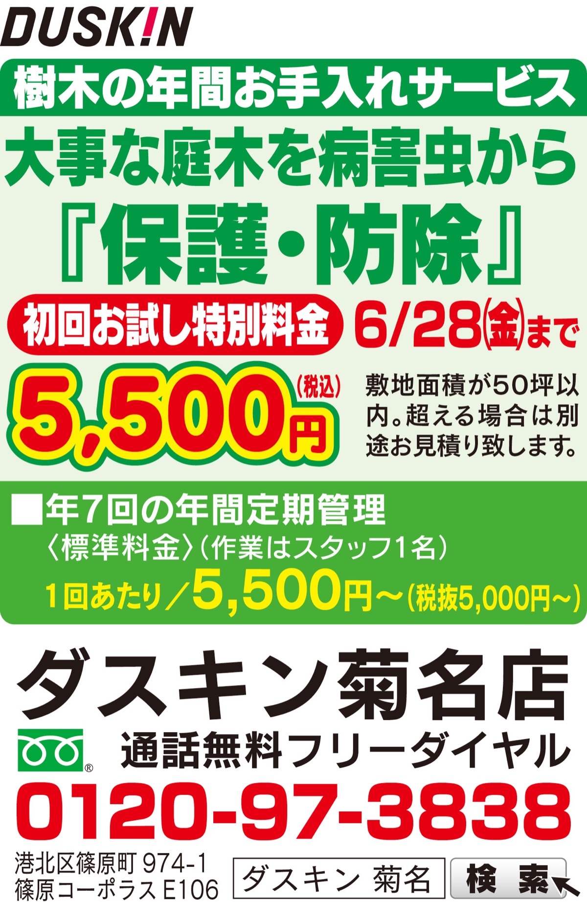 春の到来に合わせ、アブラムシやチャドクガなど厄介な病害虫が活発に活動を始めている。庭木の病気は「予防」が原則。予防と消毒の効果を知ってもらおうと、ダスキン菊名店では1回5500円〜の特別キャンペーンを実施中。