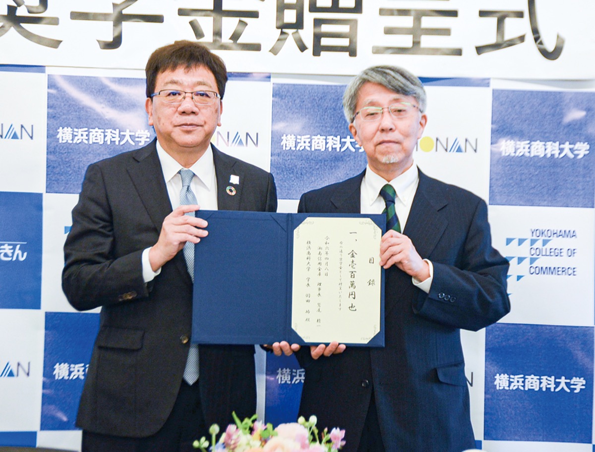 湘南信用金庫がこのほど、横浜商科大学に奨学金として100万円の寄付を行い、4月8日に東寺尾にある同大つるみキャンパスで贈呈式が行われた。