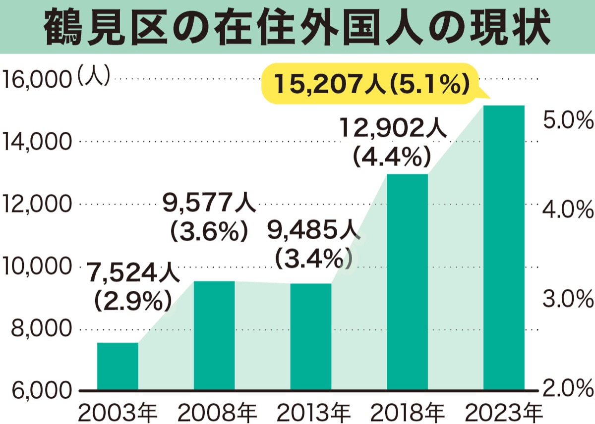 鶴見区は市内で2番目に在住外国人の数が多く、2023年末時点で1万5000人以上が暮らす。その数はこの20年で倍増し、区民の約20人に1人が外国人となる。