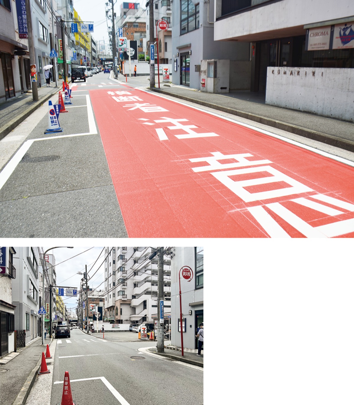今回行ったのは、「横断者注意」の路面標示と赤く色づけしたカラー塗装、交差点内のマーク設置や枠カラー塗装、自発光鋲の設置など。今後、鶴見警察署が停止線や外側線の塗り直しを進めていく。