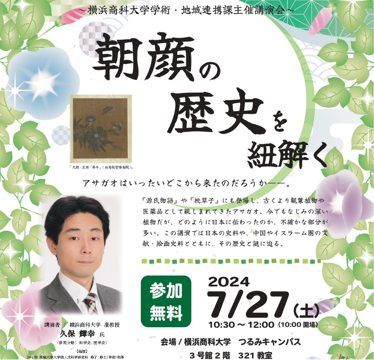 横浜商科大学主催の講演会「朝顔の歴史を紐解く」が7月27日、同大つるみキャンパス=鶴見区東寺尾4の11の1=で開かれる。参加無料。