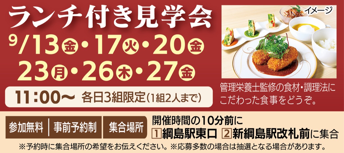 次世代と言える同住宅を見学するとともに、入居者と同じこだわりの食事を試食できる「ランチ付き見学会」を9月に開催する(左記表)。事前予約制なので左記まで申込。応募多数時は抽選。