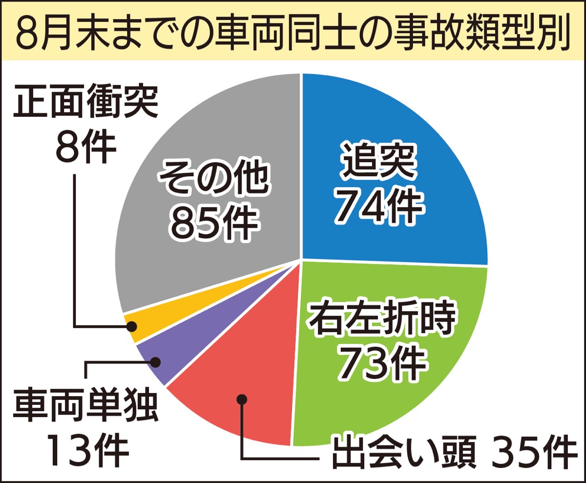 8月までの累計では、車両同士の事故では「追突」が最も多く、「右左折時」「出会い頭」と続く。