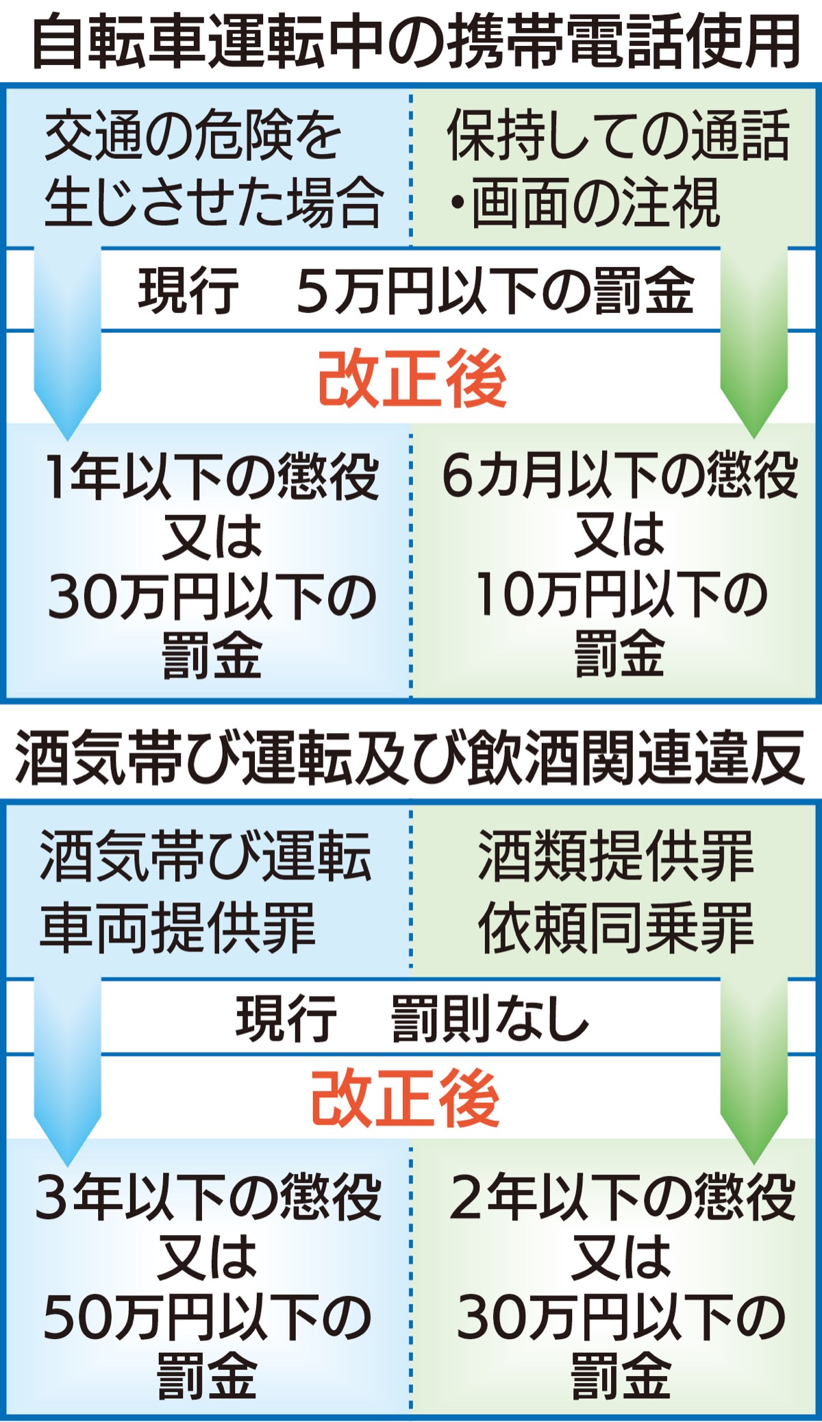 この罰則は16歳以上を対象に適用されるもので、携帯電話を使用しながらの運転や今まで罰則の対象外だった酒気帯び運転も対象となる。三木課長は「罰則となる行為は、歩行者や交通に危険を生じさせる行為。罰則があるから注意するのではなく、事故を防ぐために徹底してほしい。自転車の違反は年齢に関係なく起きているので、交通ルールの再確認をお願いしたい」と語った。