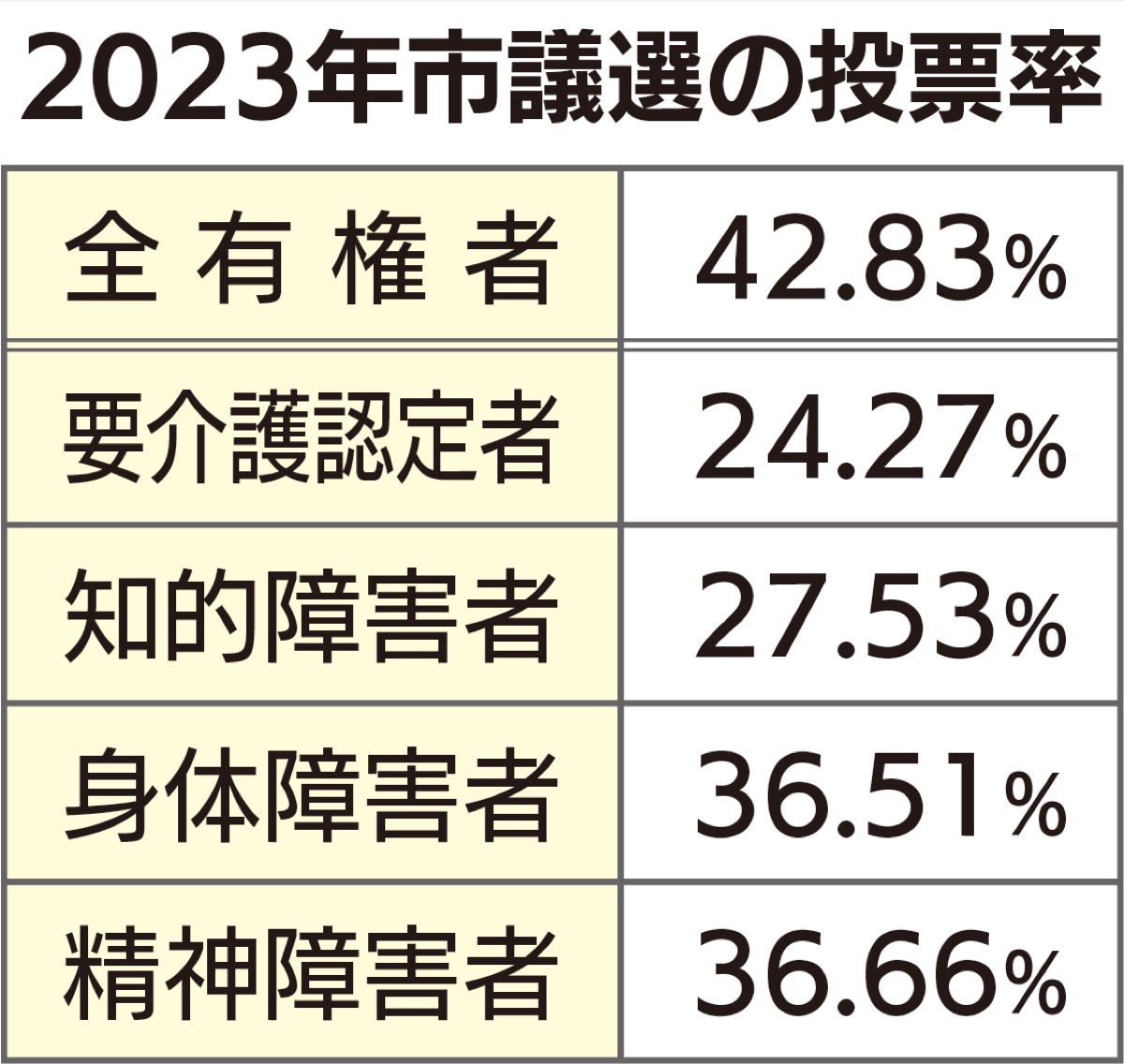 市は昨年の市議選を対象に障害者と要介護認定を受けている約28万人の投票状況を調査。結果によると、全有権者の投票率が42・83%だったのに対し、身体障害者は36・51%で、要介護認定を受けている人は24・27%だった。障害の等級・程度、要介護度が重くなるにつれて投票率が低下する傾向も分かった。