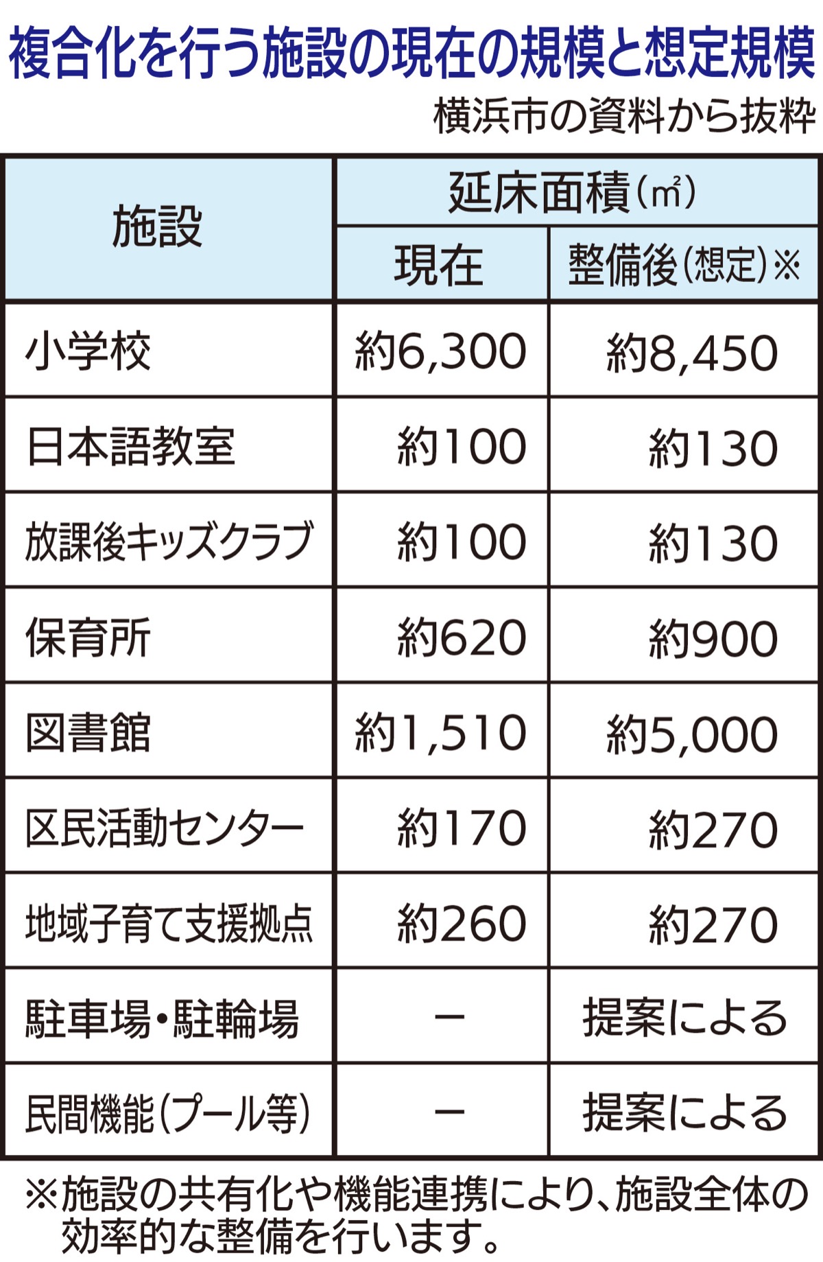 グラウンドは市の基準の3800平方メートル程度を確保するとし、学校プールについては敷地内に借地用地を確保し、民設民営での整備を目指す。また、図書館の規模は現在の3倍以上となる約5000平方メートルで、蔵書は約20万冊を想定(現在は約11万冊)。中央図書館を除くと、市内の図書館で最大規模となる。