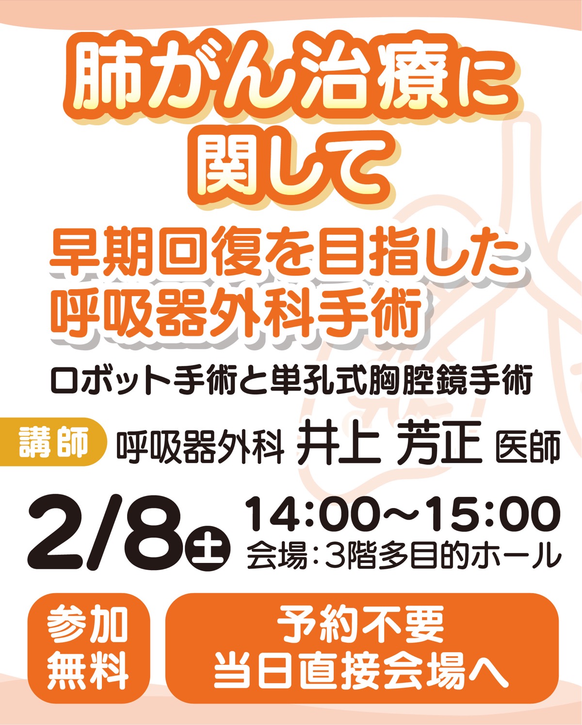 そして、同じく2月8日の午後には、呼吸器外科の専門医が肺がんの診療や最新の手術法について解説する無料講座が開かれる。