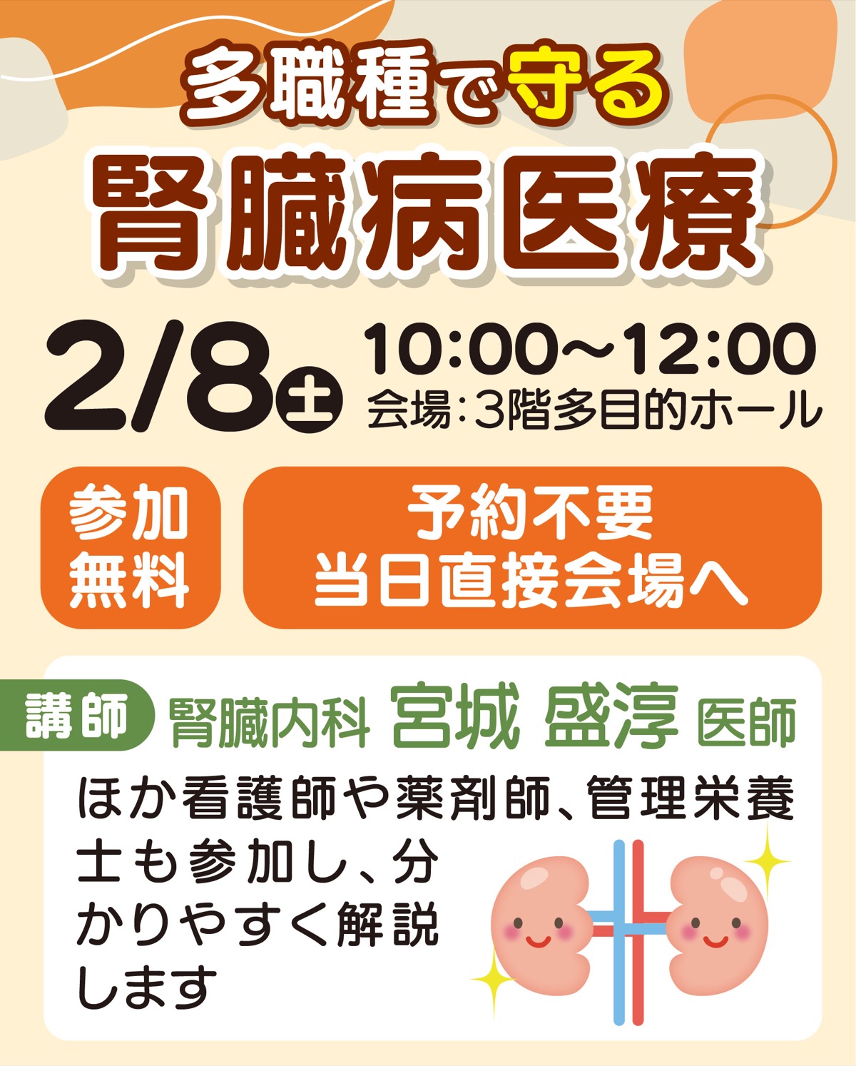 講座では、同院腎臓内科の宮城盛淳医師や看護師、薬剤師、管理栄養士が講演。多職種で患者を支える仕組みや、腎臓病の基礎知識や治療法、薬、食事療法などをそれぞれの立場から分かりやすく解説する。