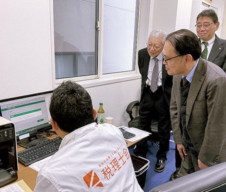 所得税などの確定申告が2月17日から始まるのを前に、鶴見青色申告会の会館でe-Taxの代理送信セレモニーが4日に行われた。