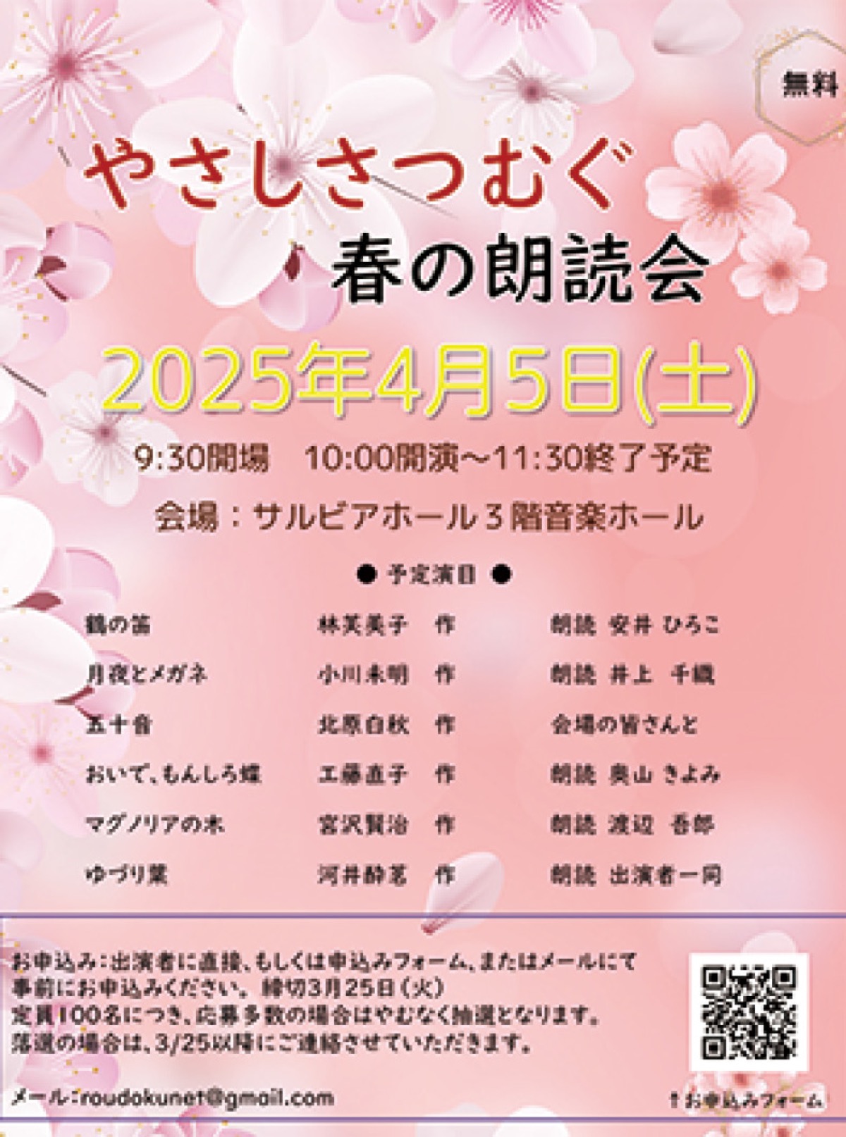 横浜朗読ネットワークによる「やさしさつむぐ 春の朗読会」が4月5日、サルビアホールで開かれる。入場無料。