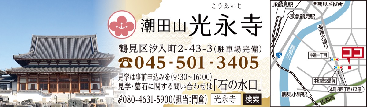 鶴見駅から車で5分。閑静な住宅街で落ち着いた雰囲気の中でお参りできる「潮田山 光永寺」。