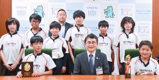豊岡小学校を拠点とするタグラグビー、豊岡土曜タグのトップチーム「豊岡オールスターズ」が3月27日、渋谷治雄区長を表敬訪問した。