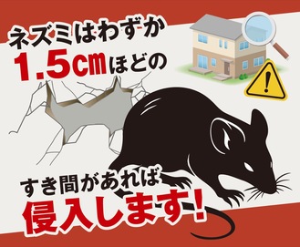 警戒心が強く夜行性のため、被害に気づきにくいのも特徴。築年数は関係なく、1・5cmほどのすき間があれば侵入されてしまう。一部は今が繁殖期のため、音がする、フンがあるなど、気になる方は相談を。※受付平日のみ土日祝定休