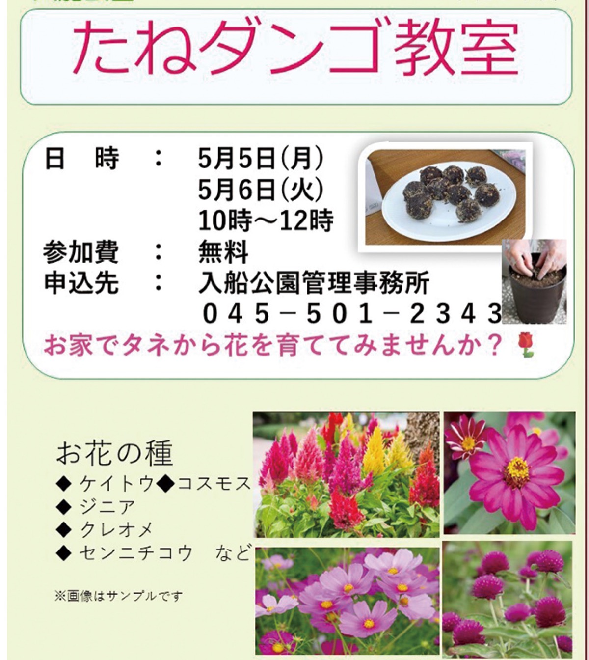 時間は両日ともに午前10時から正午。参加無料。「お家でタネから花を育ててみませんか」と同園。申込み・問合せは同園【電話】045・501・2343。