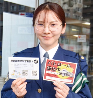 鶴見警察署はこのほど、警察官が地域の巡回の際に使用していた「パトロールカード」を鶴見署オリジナルのデザインに刷新した。制作を行った同署地域課の鈴木葵巡査部長は「犯罪抑止につながるよう、目立つデザインを意識した。ぜひ玄関先などに掲示してもらえたら」と話している。