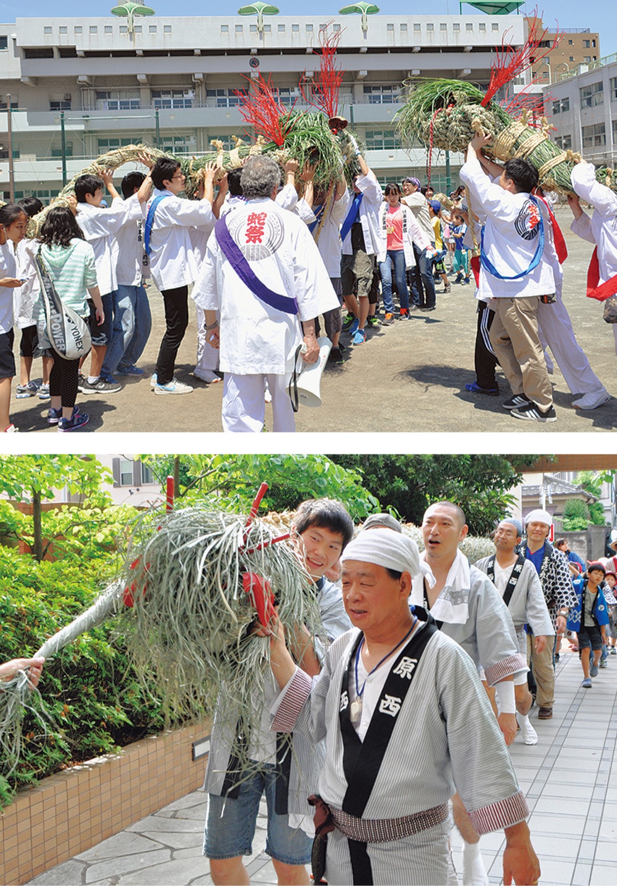 本宮は、午前8時から道念稲荷神社=生麦4の27の21=で神事を行い、その後3体が分かれてまちを練り歩く。原地区は、新明神社=生麦3の13=で午前6時30分から2体を編み、午後1時から神社でお祓いをして練り歩く。