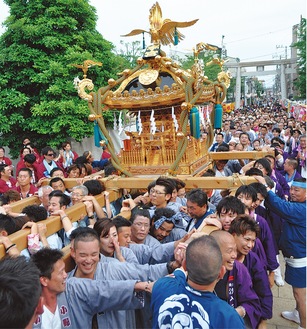 6日は午後5時から例大祭式典。7日は午後5時から各町会の神輿による連合渡御。そして、8日には宮神輿が登場。宮出しは午前8時。今年のルートは「西廻り」で、宮神輿が町会を練り歩く。宮入は午後5時ごろ。露店は7日、8日ともに午後8時まで。