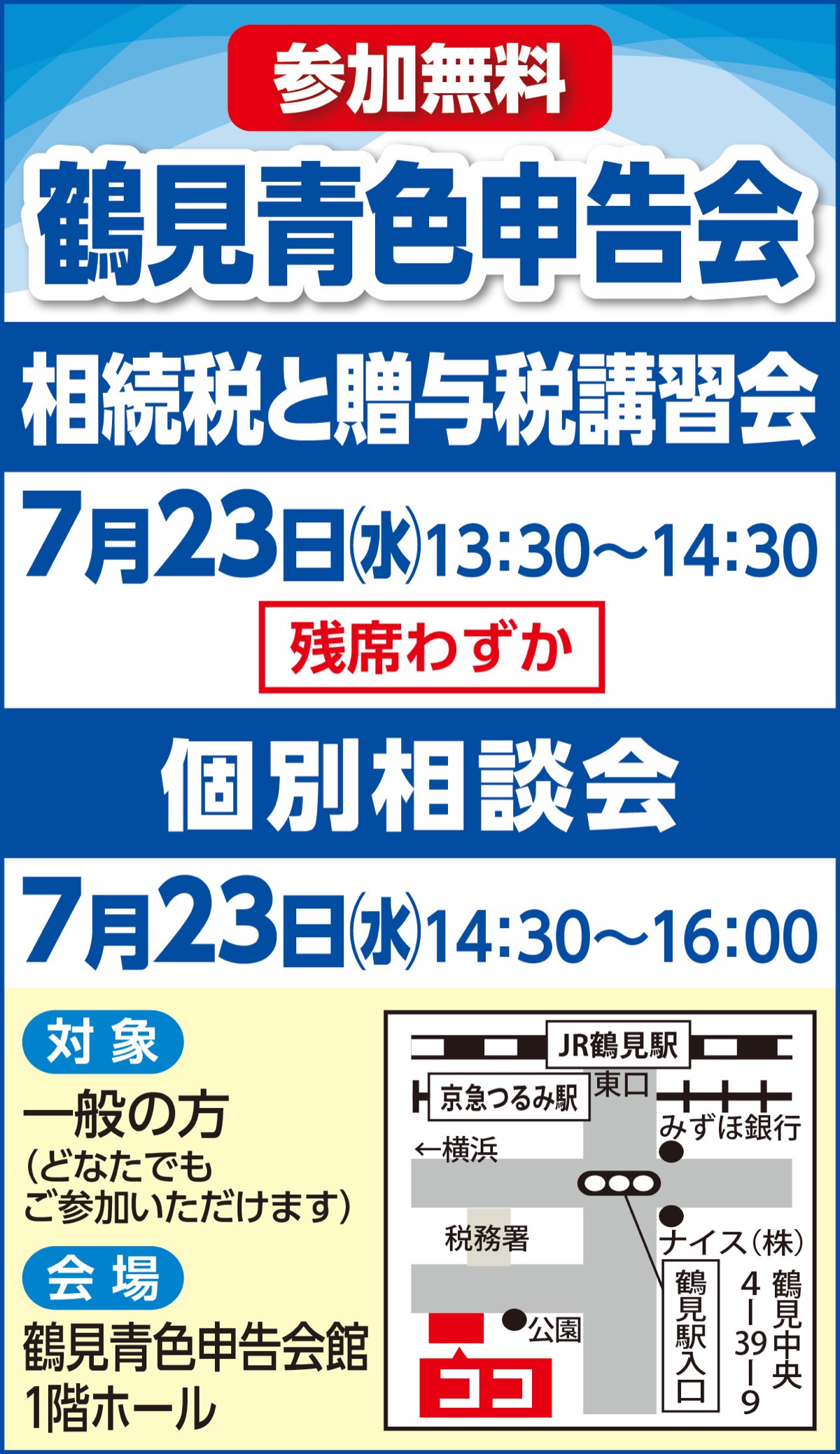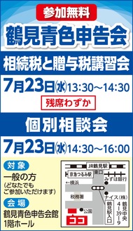 鶴見青色申告会が相続税と贈与税に関する税務講習会と個別相談会を7月23日(水)に開催する。