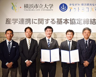 横浜市や神奈川県の観光情報を発信する(株)アットヨコハマ=神奈川区=と横浜市立大学が産学連携に関する基本協定を結び、このほど締結式が行われた。