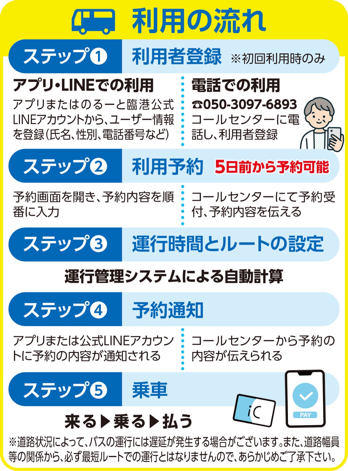 オンデマンドバスは、時刻表や決まった運行経路がない予約型の乗合バス。乗車・降車場所を30カ所から選んで予約でき、予約は専用のスマートフォン向けアプリ「のるーと」やLINE、電話で5日前から可能。