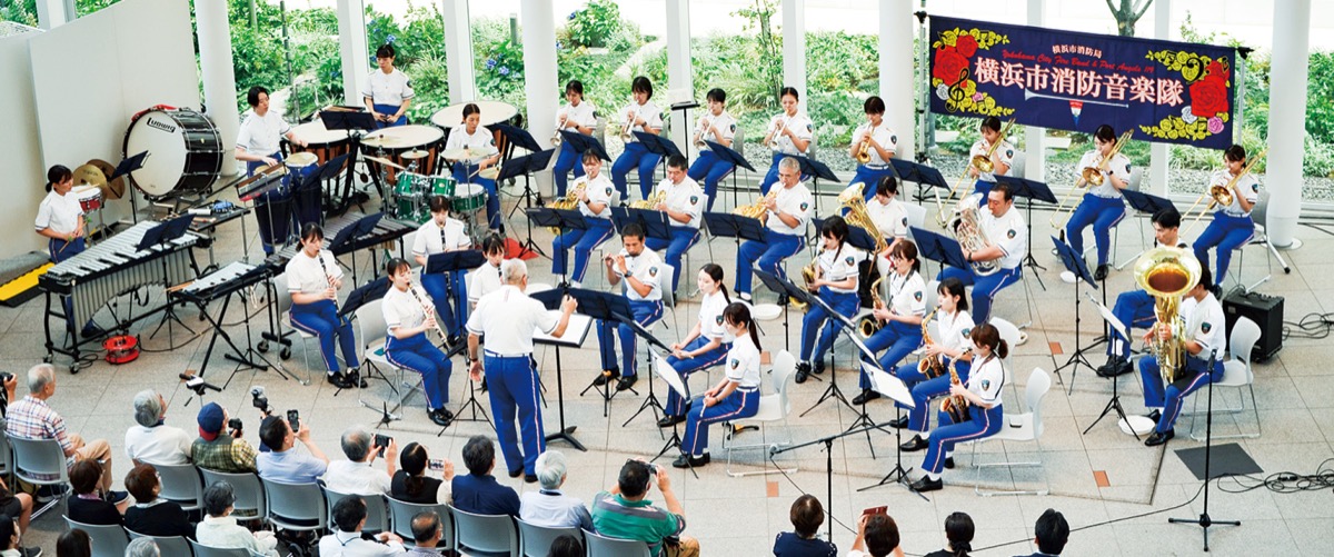 市役所のアトリウムでこのほど行われた横浜市消防音楽隊によるお披露目コンサートには、約280人の観客が集まり、初の演奏を楽しんでいた。