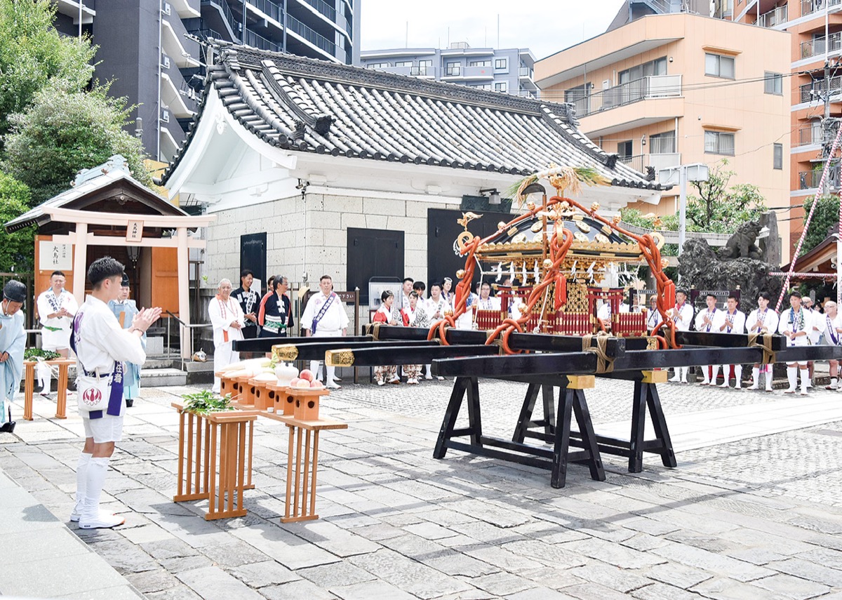 当日は、朝から照り付ける日差しの中、境内で式典が行われた。氏子青年会を中心に各町会の担ぎ手たちが、威勢の良い掛け声とともに住宅街や各町会を練り歩いた。氏子青年会の鈴木吉太郎会長は「暑い中、本当にみんな頑張ってくれた。私は会長として最後の年になるが、誰も怪我なく無事に終えることができて良かった」と労った。