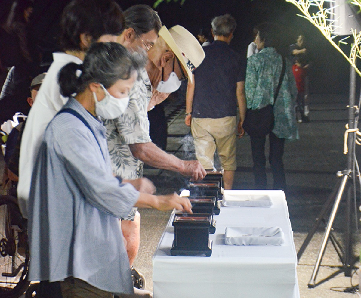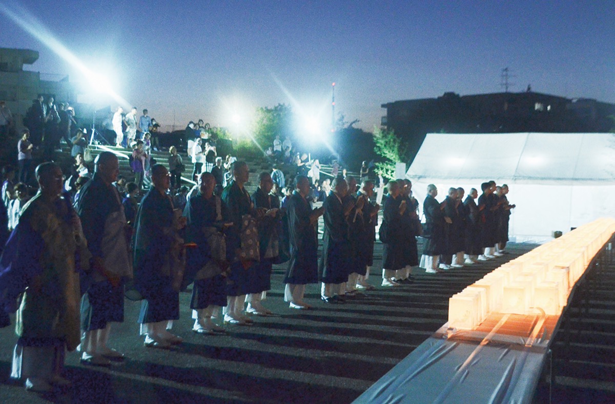 灯ろうに灯りをともし、先祖を供養する仏事・盂蘭盆会が7月29日、佃野公園そばの鶴見川沿いで行われた。鶴見区仏教婦人会(生方文会長)が主催したもの。