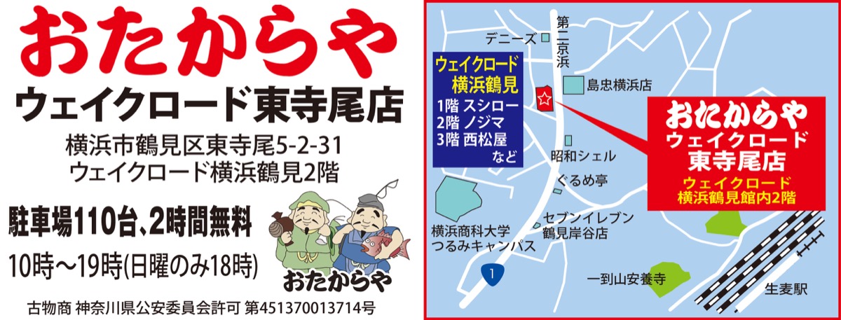 場所は鶴見区東寺尾の商業施設「ウェイクロード横浜鶴見」の2階。店頭・出張ともに、無料で査定に対応している。駐車場は2時間無料で利用可能で、「買い物ついでのご来店もお待ちしています」とスタッフ。まずは電話で予約を。